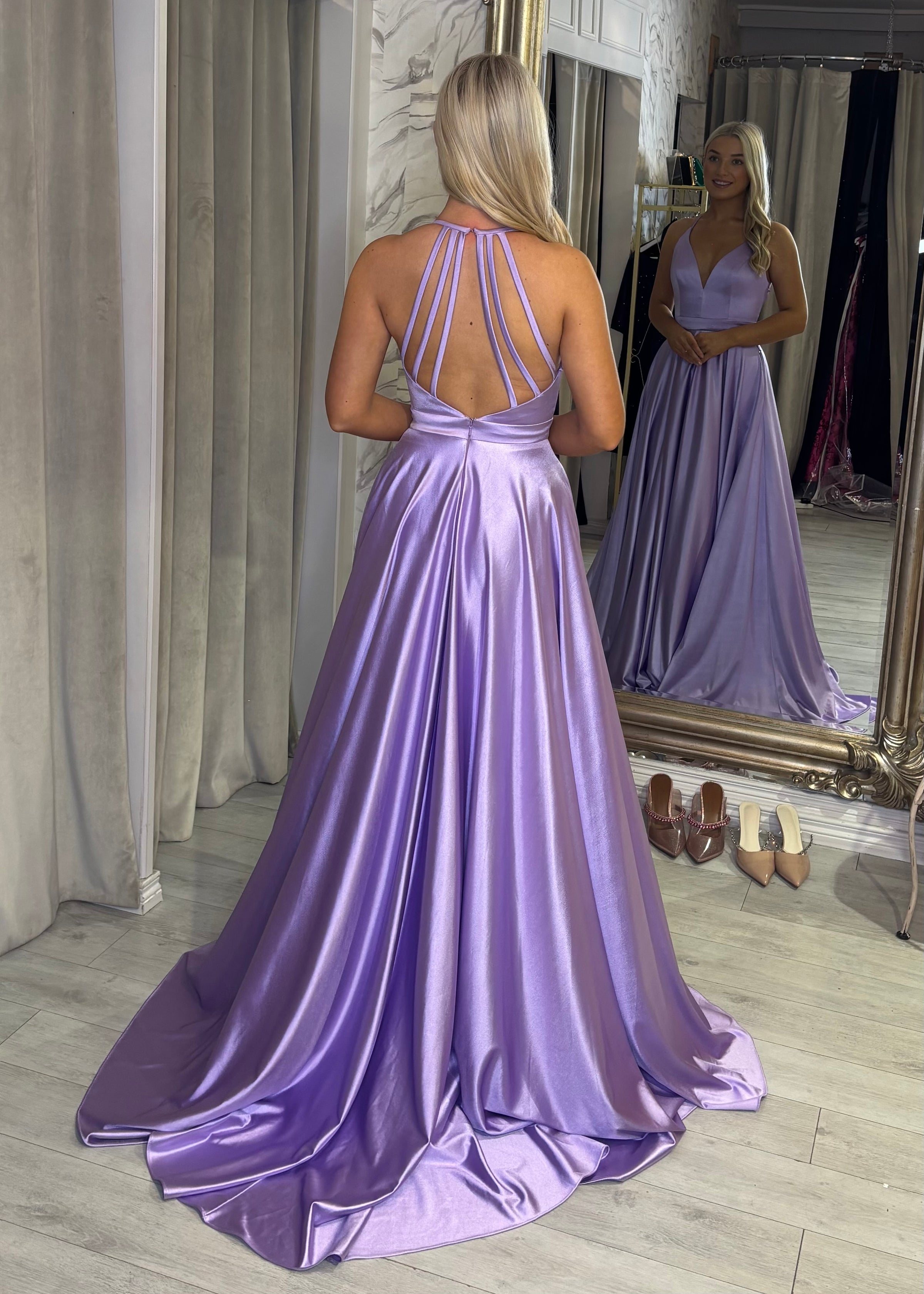 Lilac Satin Ballgown With Halter Neckline